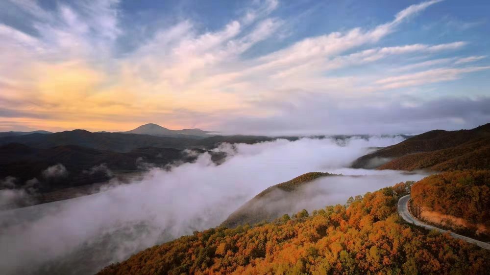 由于气温波动幅度较大,冷暖空气在山脉相汇,产生烟波浩渺的云海奇观。沿着蜿蜒的牡丹江,放眼望去,一座座山川犹如披上迷人的彩装,寒潮如染坊一般,将莲花湖畔妆点得层林尽染。林口县山地林区植被茂盛,林海与河流交相辉映勾勒出一幅美如诗画的山间美景,让人流连忘返。(尚城)